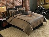 California King size comforter set made of distressed faux suede in the color of camel with a large screen print of a printed tattoo design of a pierced heart logo and sword through it with metal studded trim in a gothic bedding. Color: Camel. One - California King Size Comforter measuring 112 inches x 98 inches. One - King Size bedskirt. Two - King size pillow shams.More California King Comforter Set Products